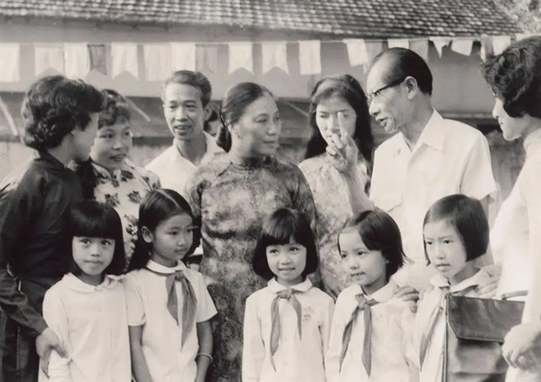 Bộ trưởng Bộ Giáo dục Nguyễn Thị Bình trò chuyện cùng các giáo viên và học sinh Trường Lê Ngọc Hân, Hà Nội (ngày 15/9/1976)