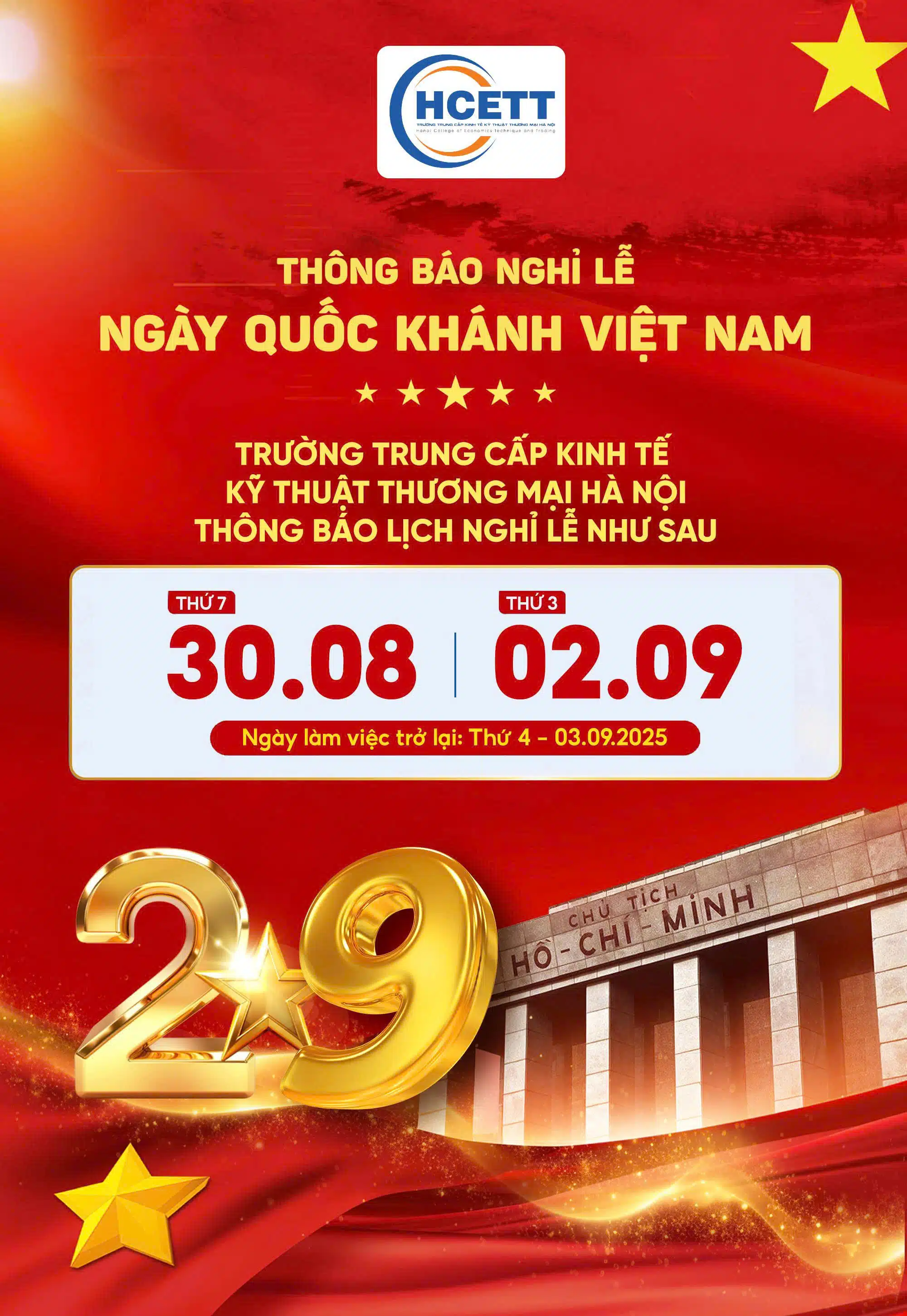 Căn cứ theo quy định của Nhà nước về việc nghỉ lễ Quốc khánh 2/9, Trường Trung Cấp Kinh Tế Kỹ Thuật Thương Mại Hà Nội trân trọng thông báo tới toàn thể cán bộ, giảng viên, nhân viên và sinh viên lịch nghỉ lễ như sau: