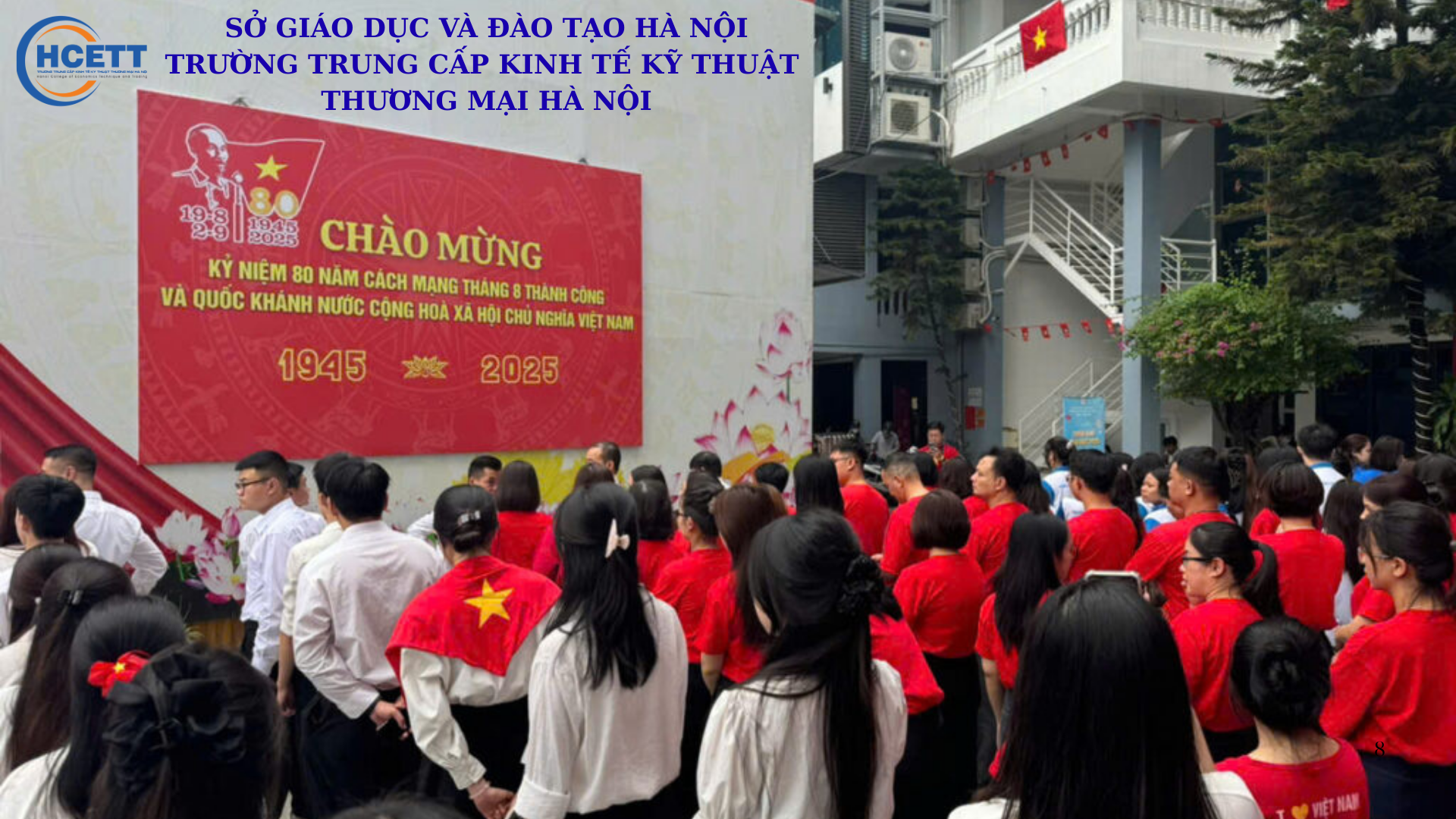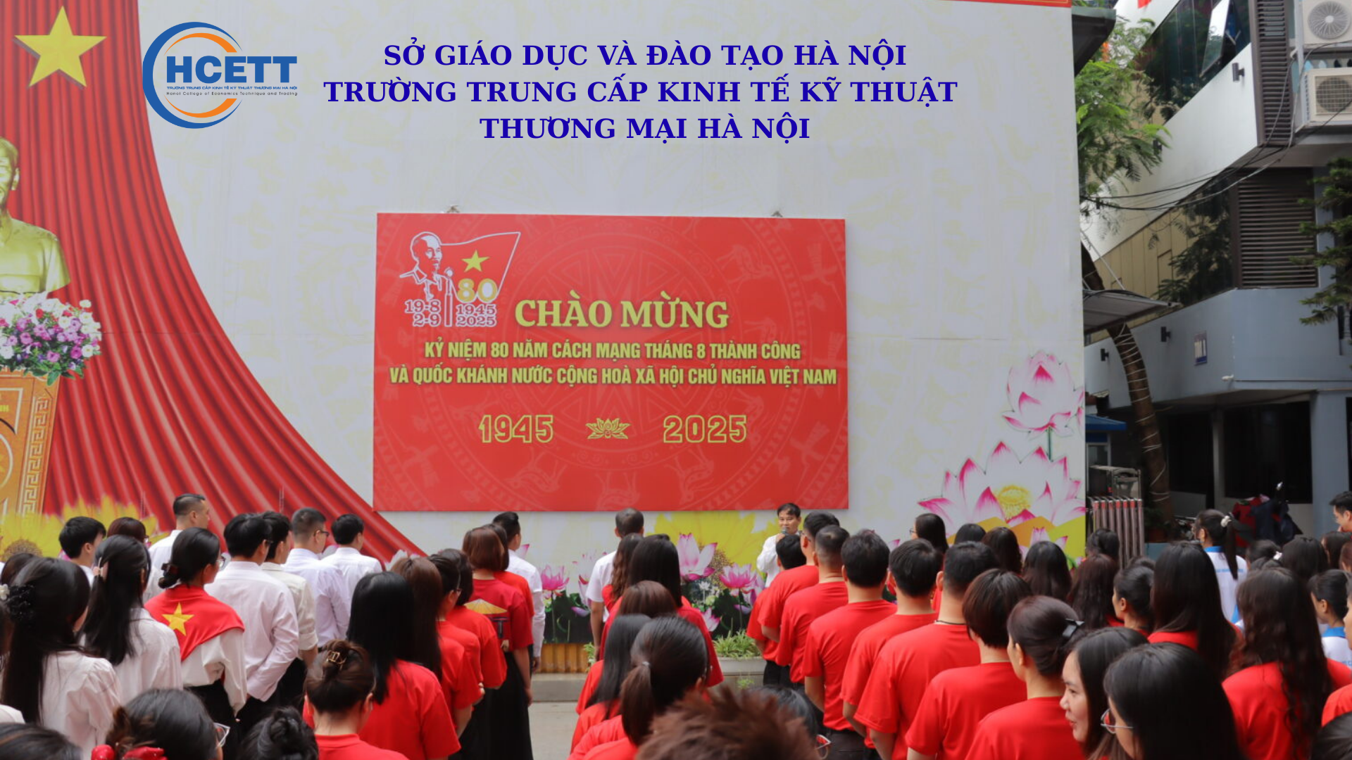 Sáng ngày 25 tháng 8 năm 2025, Trường trung cấp Kinh tế Kỹ thuật Thương mại Hà Nội đã tổ chức Lễ chào cờ đặc biệt, sự kiện này không chỉ là nghi thức thiêng liêng mà còn là dịp để ôn lại những trang sử hào hùng, những khoảnh khắc lịch sử của dân tộc để mỗi chúng ta tưởng nhớ và biết ơn các thế hệ cha ông đã hy sinh vì nền độc lập, tự do của tổ quốc.